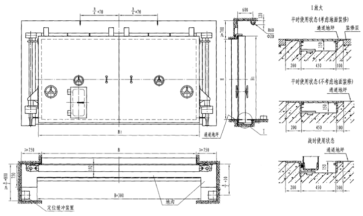 此類門的特點(diǎn)是平時(shí)地面無(wú)門檻,便于人員和車輛通行;戰(zhàn)時(shí)將門扇立轉(zhuǎn)、降落及平移,以滿足防護(hù)、密閉要求,其上帶有方便人員臨時(shí)出入的小門,平戰(zhàn)轉(zhuǎn)換快捷。新型降落門改進(jìn)了其升降機(jī)構(gòu),操作更為方便。