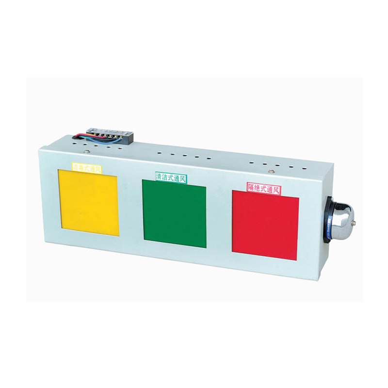 2、燈箱的結構:用于工程掩體內部空氣質量狀態的顯示和報警,主要對三種空氣質量情況進行報警:清潔、隔絕、濾毒。燈箱分別用三種顏色的燈光來對三種不用空氣情況報警:清潔——綠色燈光;隔絕——紅色燈光;濾毒——黃色燈光。