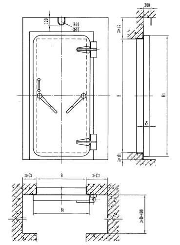| 型號 | 門孔寬B | 門孔高H | 門扇厚δ | B1 | H1 | C1 | C2 | D1 | D2 |